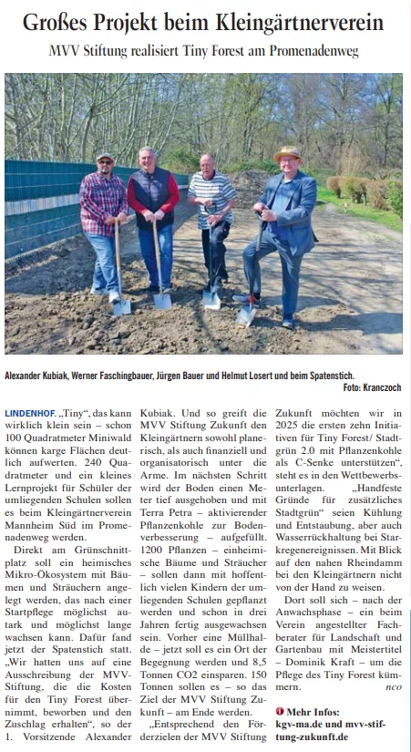 2025 entstand auf dem Gelände des Kleingärtnervereins Mannheim-Süd ein Tiny Forest: Im Juni wurde der Boden einer 240 Quadratmeter-Fläche mit Pflanzenkohle und einem Terra Preta Substrat angereichert, Ende Juli folgte dann eine große Pflanzaktion. Gemeinsam mit Schüler:innen und Kindergartengruppen wurden heimische Sträucher und Bäume gesetzt. Den Zeitpunkt – direkt vor den Sommerferien – haben die Verantwortlichen bewusst gewählt: Beim Schulstart im September können die beteiligten Kinder und Jugendlichen dann direkt bewundern, wie sehr der von ihnen gepflanzte Miniwald bereits gewachsen ist.